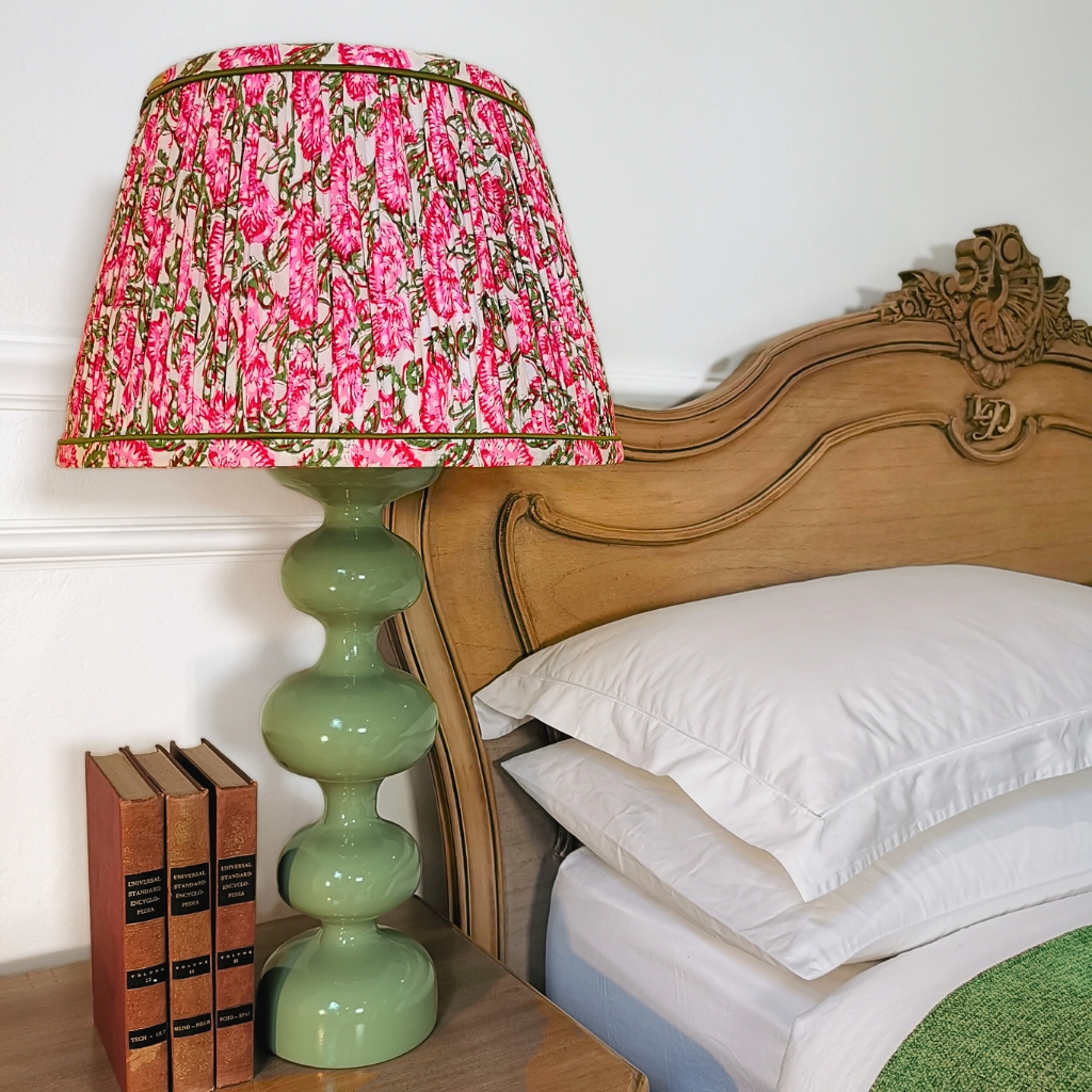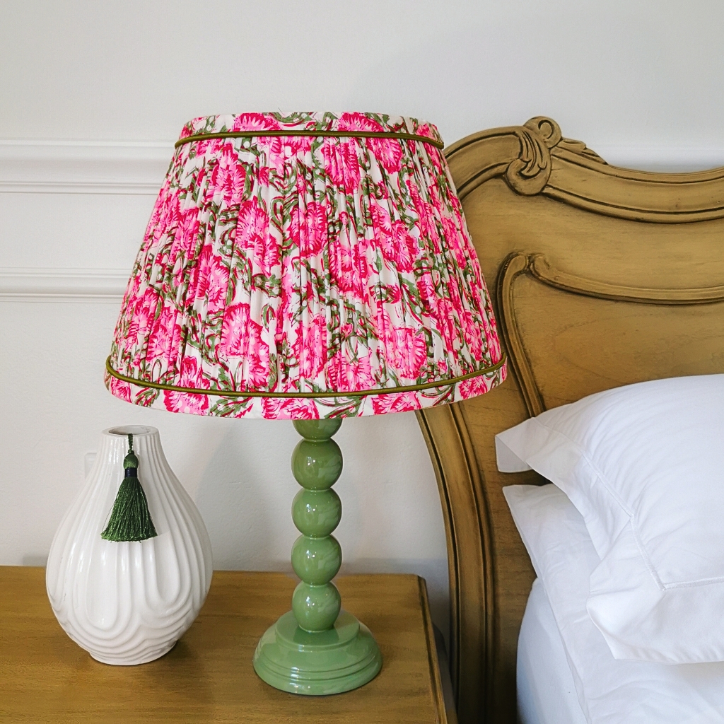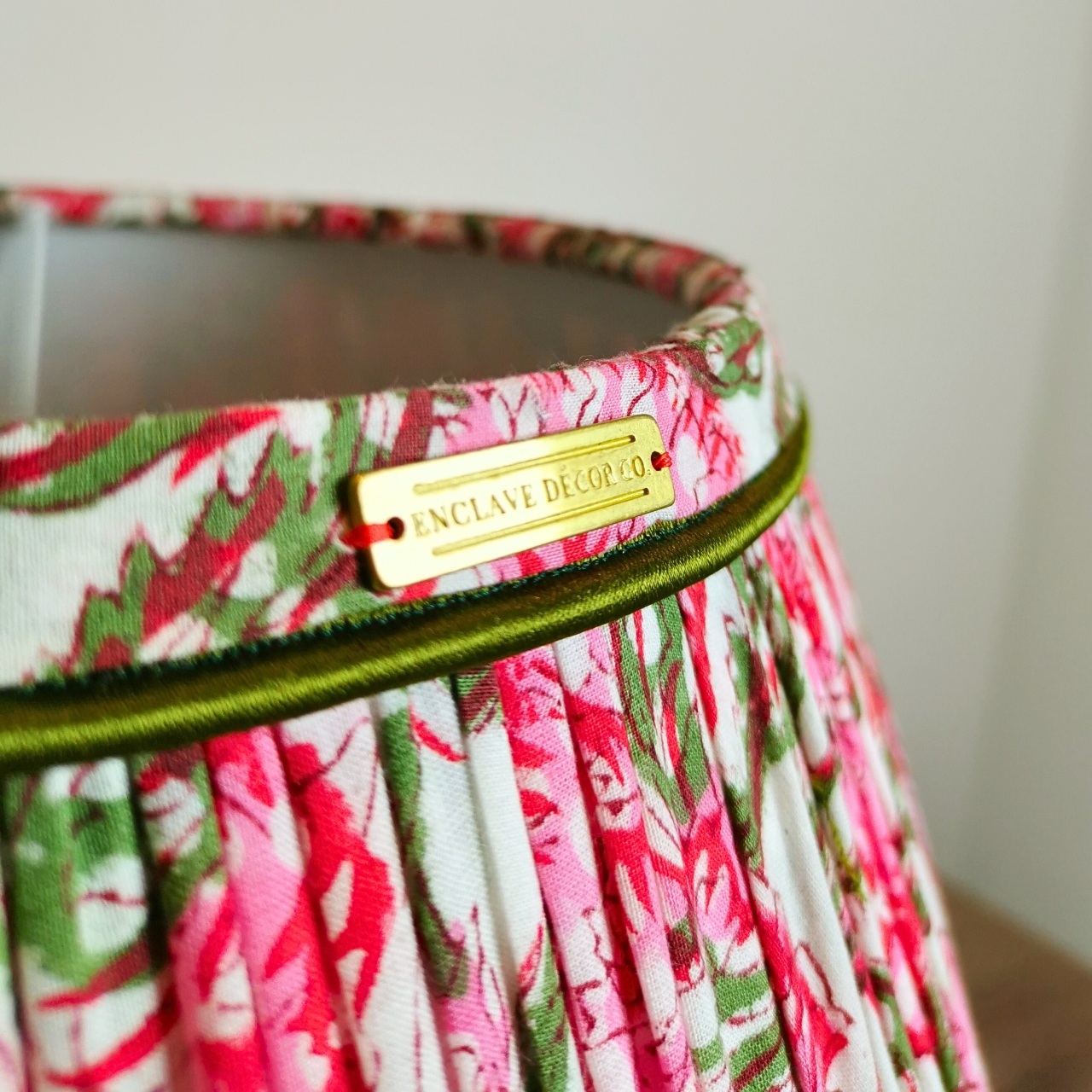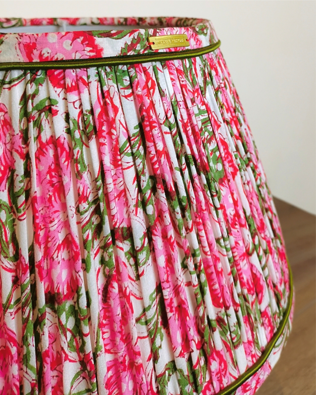 This gathered lampshade is made of 100% cotton fabric handprinted in Jaipur, India. Add a touch of timeless charm to your space with this pink floral block print fabric. Handcrafted using traditional block printing techniques, this fabric features delicate floral motifs in pink hues, creating a harmonious blend of elegance and heritage.