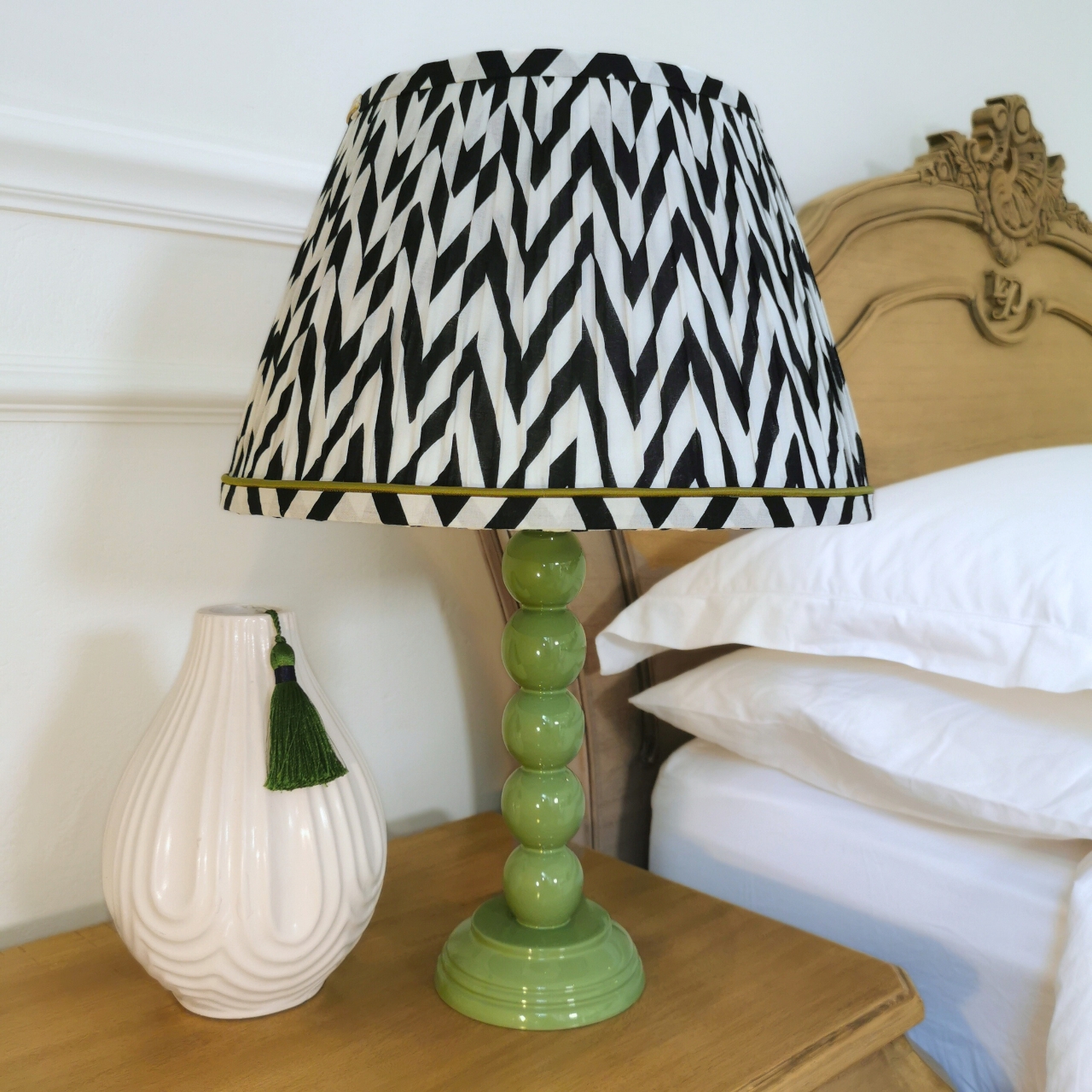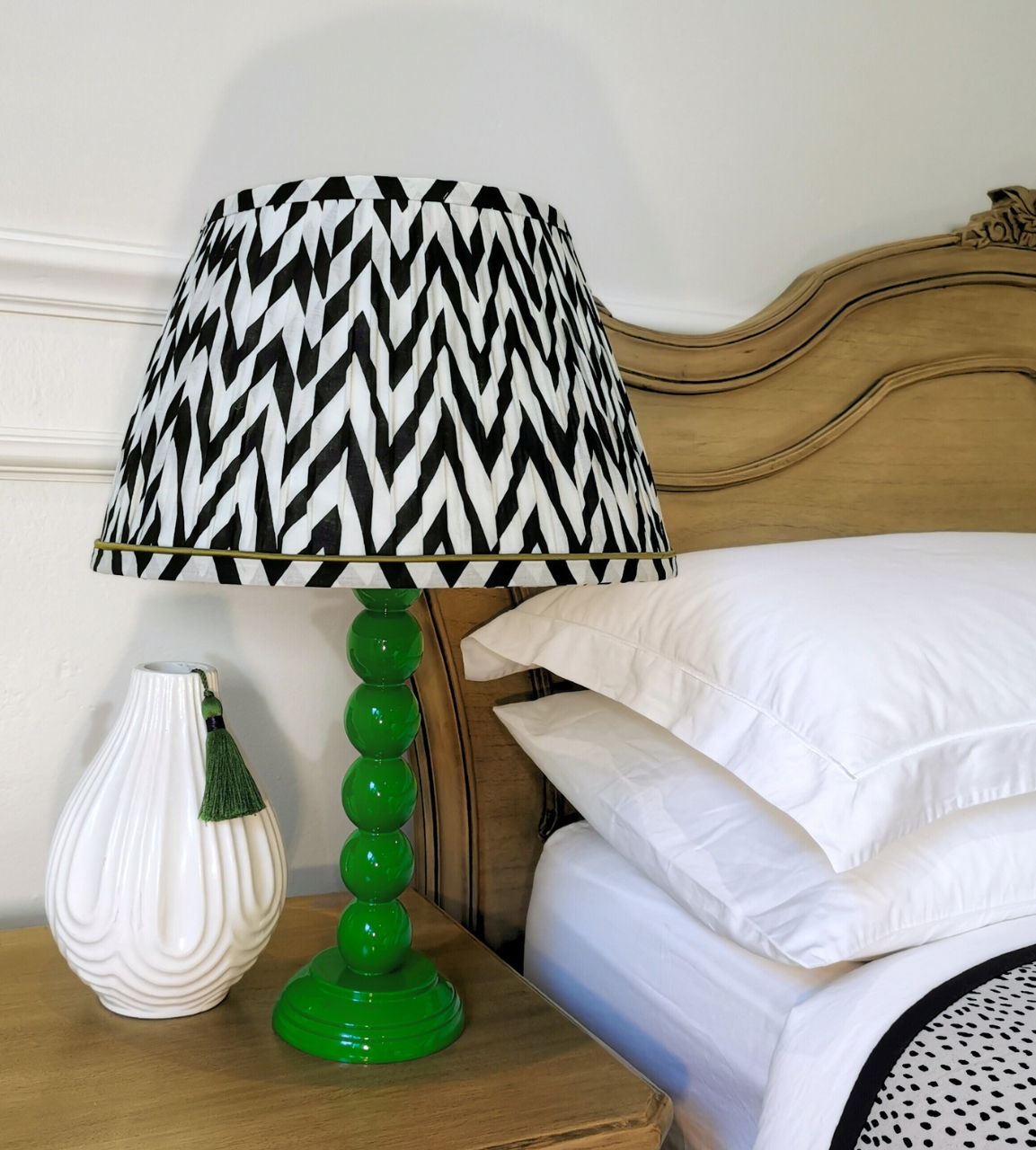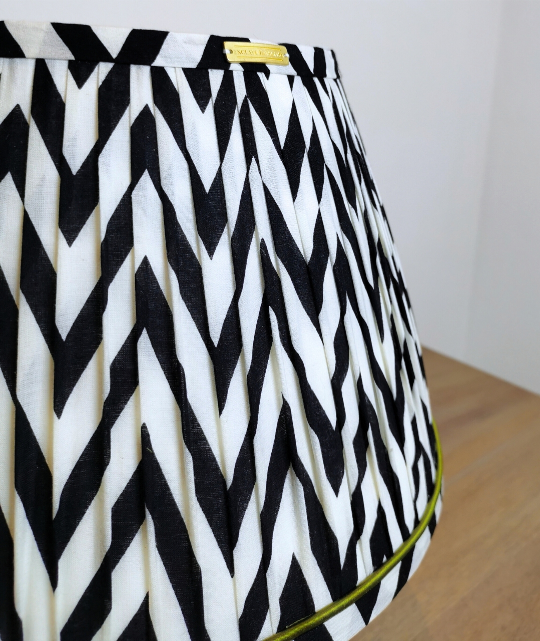 Make a bold statement with this striking lampshade. Featuring a classic zigzag pattern hand-printed using traditional block printing techniques, this fabric blends timeless design with artisanal craftsmanship. The crisp contrast between black and white adds modern edge, while the subtle imperfections of hand printing lend it character and authenticity.